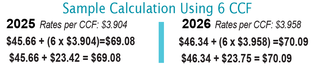 (A) CCF = 100 cubic feet (B) Rates per CCF: $3.904 in 2025; $3.958 in 2026